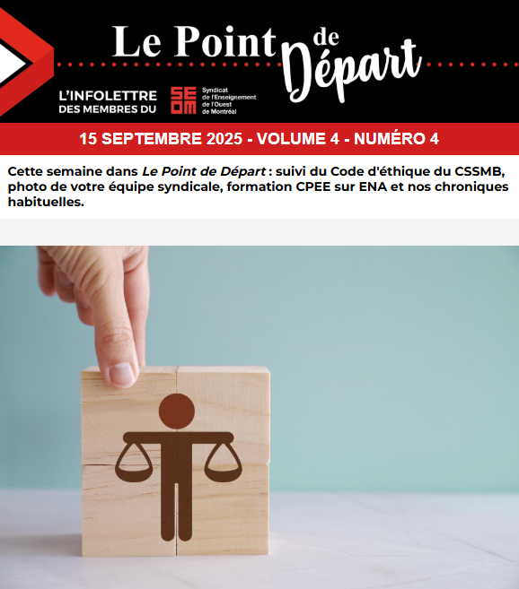 Le Point de Départ, Vol. 4, No. 4 Dans ce numéro… – Suivi sur le Code d’éthique du CSSMB – Envoyez-nous une photo de votre équipe syndicale