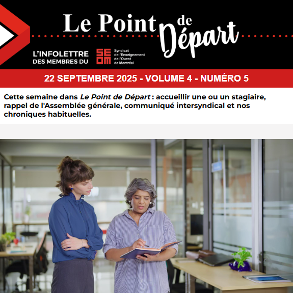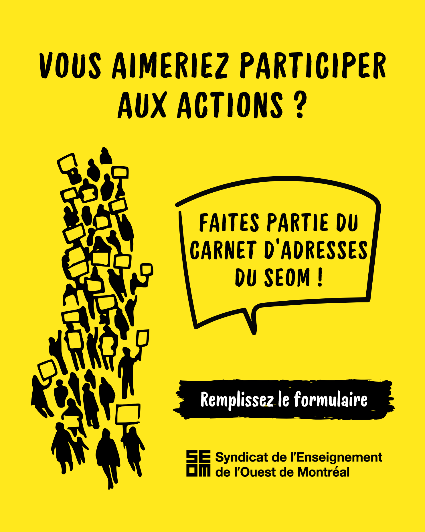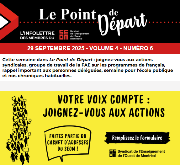 Le SEOM souhaite former un carnet d’adresses des personnes intéressées à participer aux différentes mobilisations, qu’il s’agisse de manifestations, d’actions citoyennes ou d’initiatives locales et nationales. Dans le contexte actuel où la CAQ multiplie les attaques contre la profession enseignante, il est essentiel de faire entendre notre voix. Inscrivez vos coordonnées et vos disponibilités dans le formulaire.